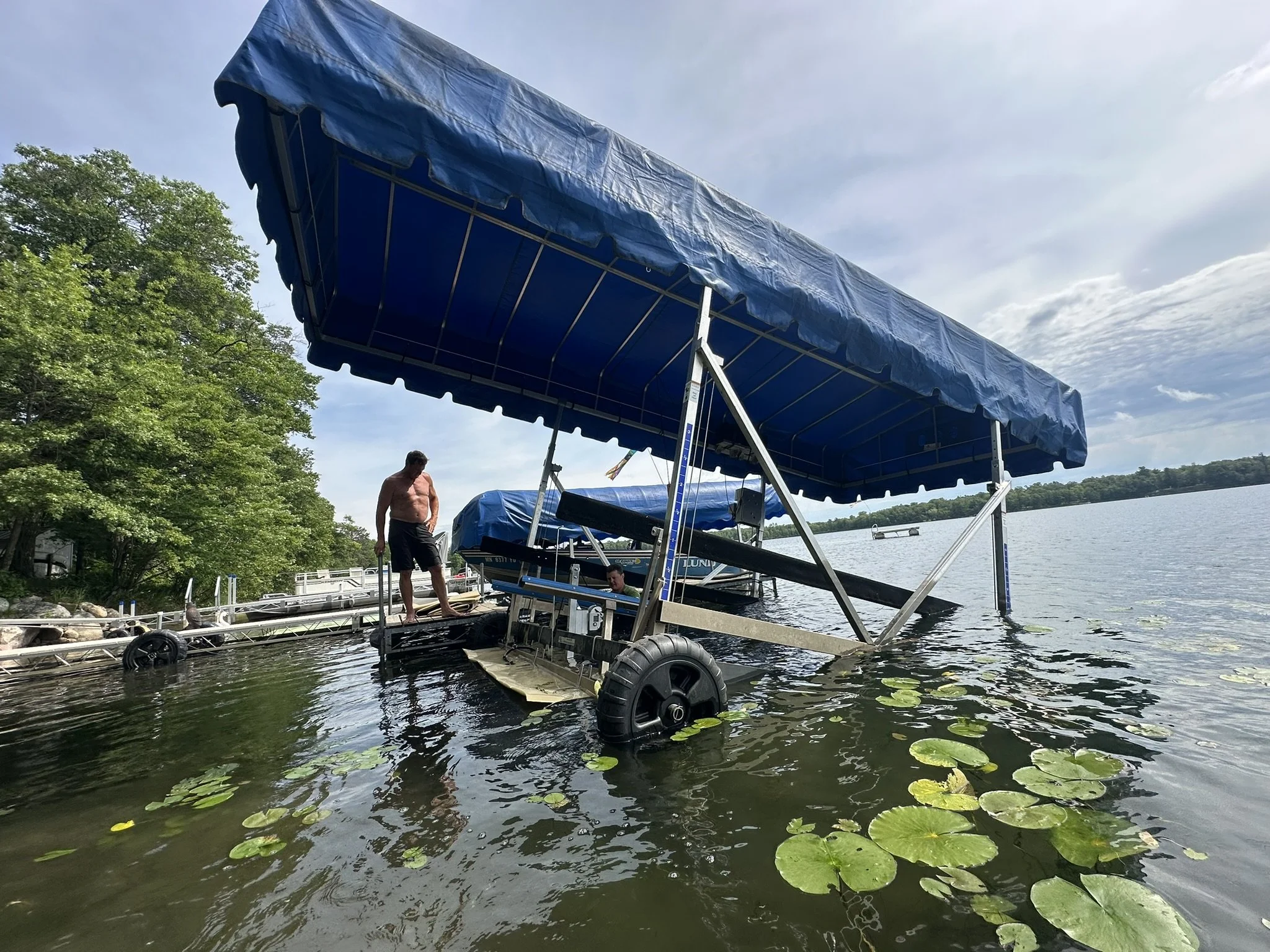 Without our airbag system this boat lift jack can be used to adjust corner posts to level boat lift in water. Or used to raise the hoist frame to install or remove boat lift wheels.